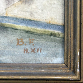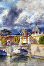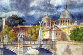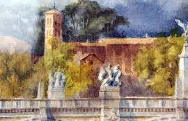 Scorcio su Ponte Sant'Angelo, acquarello su carta, cm 31x26, siglato, entro cornice.
