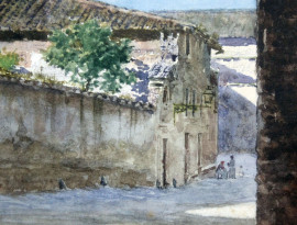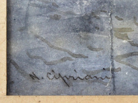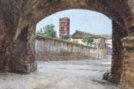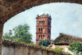 Scorcio sul campanile di S.Cecilia, acquarello su carta, cm 38,5x53,5, firmato Nazareno Cipriani, entro cornice.