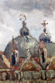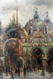Scorcio sulla Basilica di S.Marco a Venezia, olio su compensato, cm 35x25, XX secolo, entro cornice.