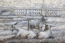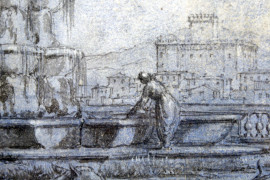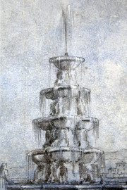 Scuola italiana del XVIII secolo, Veduta panoramica di città italiana con fontana, acquarello su carta, cm 20x32,5, entro cornice.
