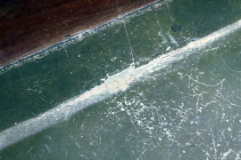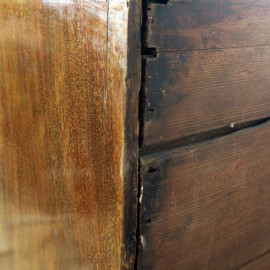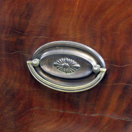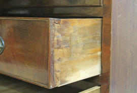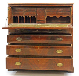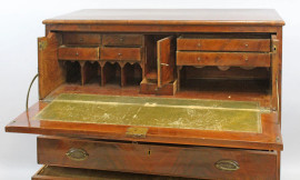 Secrétaire in mogano e piuma, Inghilterra, XIX secolo, fronte a quattro cassetti ed uno sportello a calatoia uso scrittoio, celante cassettini e vuoti all'interno, cm h 113,5x107x52, (difetti).