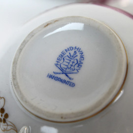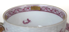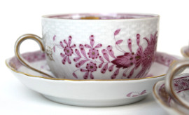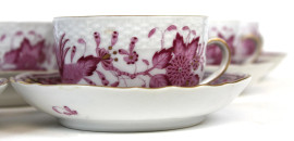Servizio da tè in porcellana bianca con decori floreali color malva, composto da dodici tazzine e dodici piattini, diam. max cm 13,5, marchio Herend alla base, (lievi difetti).
