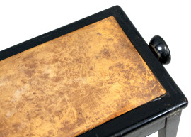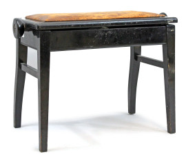 Sgabello da pianoforte in legno laccato nero, XX secolo, seduta regolabile in cuoio, poggiante su quattro gambe mosse, cm 46x31,5x61,5, (difetti).