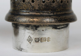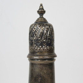 Spargizucchero in argento sbalzato e traforato, bolli della città di Sheffield 1895, cm h 15, gr. 250