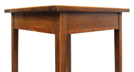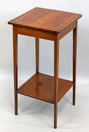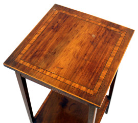 Tavolino di linea quadrata in mogano, XIX secolo, filettatura in vari legni pregiati, poggiante su quattro gambe troncopiramidali riunite da pianetto, cm h 72x36,5x36,5, (segni del tempo).