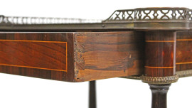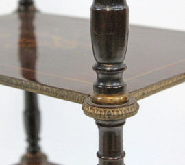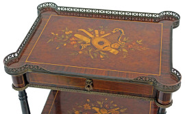 Tavolino in noce e radica, Francia, XX secolo, piano di linea sagomata con bordo a ringhiera traforata, fronte ad un cassetto, due ripiani, intarsi raffiguranti strumenti musicali, montanti torniti, cm h 80x50x38, (difetti).