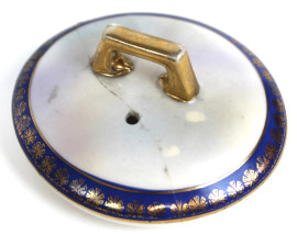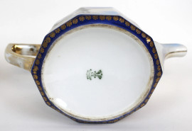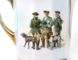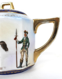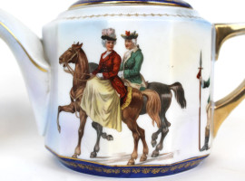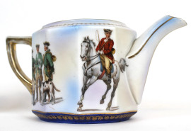 Una teiera ed una lattiera in porcellana policroma, decori raffiguranti ufficiali in divisa con cani, particolari dorati, alt. max cm 17, marchio C.T. Altwasser Slesia alla base, inizi XX secolo, (difetti e restauri).