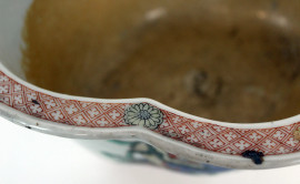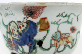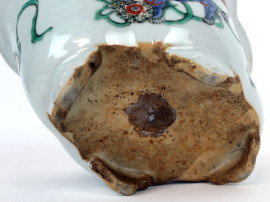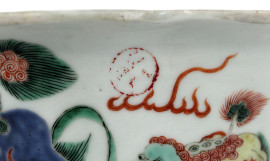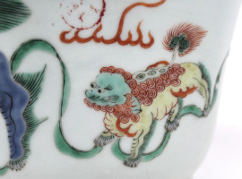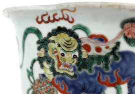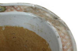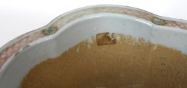 Vaso di linea quadrilobata, Cina, XIX secolo, in ceramica smaltata e dipinta a motivo di fiori ed animali fantastici, cm h 11x22, (lievi difetti).