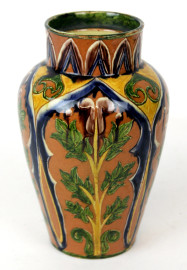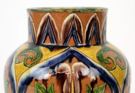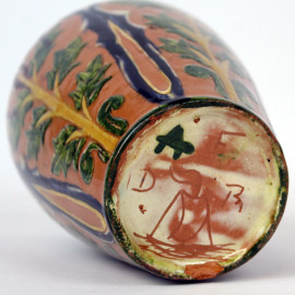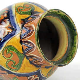 Vaso in ceramica smaltata e dipinta a motivi astratti e a foggia di rami con foglie, cm h 16, marchio alla base.