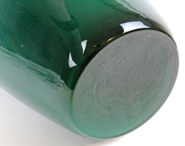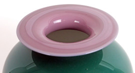 Vaso in vetro verde a corpo bombato, bordo lilla, interno bianco, cm h 36, XX secolo