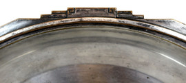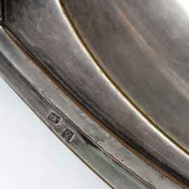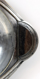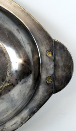 Vassoio déco di linea ovale in metallo argentato, prese con applicazioni in legno, cm h 4,5x37,5x23,5, (segni del tempo).