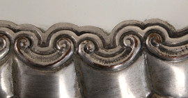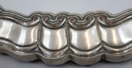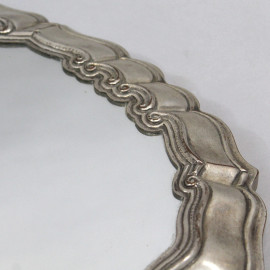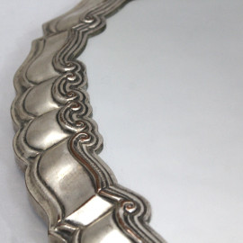 Vassoio di linea ovale centinata in legno e metallo argentato con piano a specchio, cm 64x41.