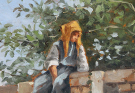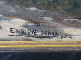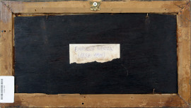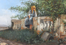 Veduta della campagna romana con figura, olio su tavola, cm 17,5x35, firmato, entro cornice.