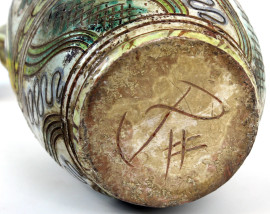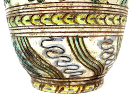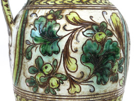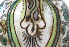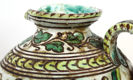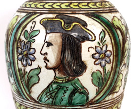 Versatoio in ceramica smaltata in policromia, decoro raffigurante profilo di nobiluomo, foglie e motivi astratti, cm h 31, marcato alla base, (difetti)