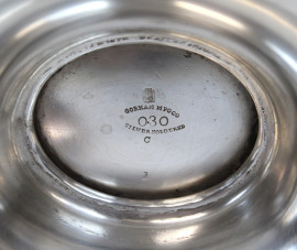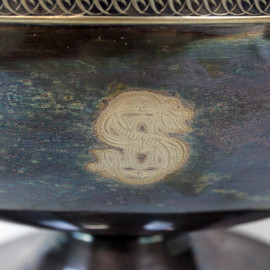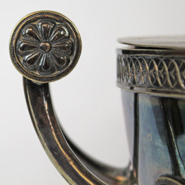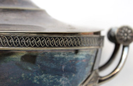 Zuppiera con coperchio in metallo argentato e peltro, cm 18,5x37, XX secolo, (difetti).