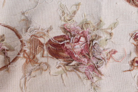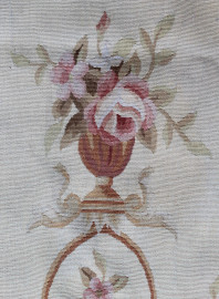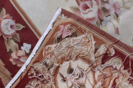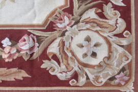 Abousson ricamato a motivi di volute e fiori, campo a fondo beige e rosso, cm 160x90, (segni di utilizzo).