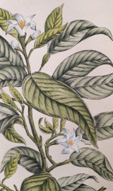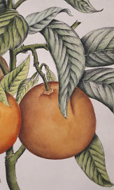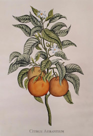 Antica rara tavola di botanica finemente acquarellata a mano originale raffigurante Citrus Auranticum, cm 64x50