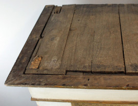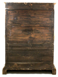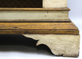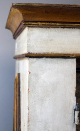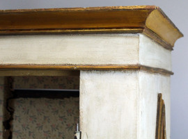 Armadietto in legno laccato con particolari dorati, piedi a mensola, inizi XX secolo, cm h 171x126x50, (mancanti sportelli).