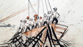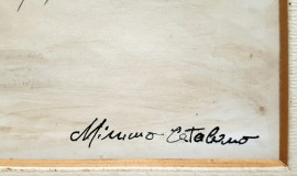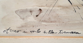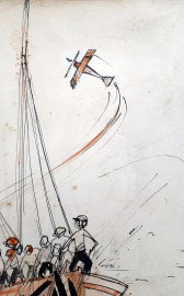 Artista futurista siciliano del XX sec., Aereo in volo sulla tonnara, tecnica mista su carta, firmato Mimmo Catalano (XX sec.), cm 35x24, firmato e titolato in basso
