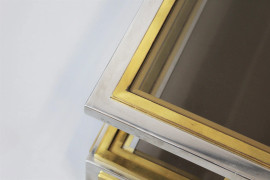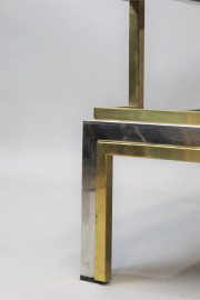 Basso tavolino di linea rettangolare, XX secolo, doppio ripiano in vetro poggiante su struttura in acciaio, cm h 40,5x120,5x65, (segni del tempo).