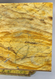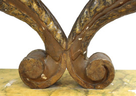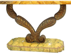 Basso tavolino rettangolare costruito con elementi antichi, piano laccato a finto marmo sorretto da fregi scolpiti a foglie d'acanto, base di linea sagomata, cm h 50x81x39, (segni del tempo).