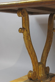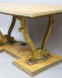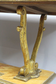 Basso tavolo di linea rettangolare costruito con elementi antichi, piano e base dipinti e laccati a finto marmo, sorretti da coppia di fregi dorati, cm h 55x121x62, (segni del tempo).