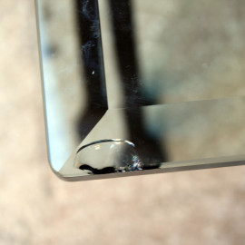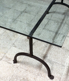 Basso tavolo linea rettangolare, XX secolo, piano in cristallo, poggiante su coppia di montanti in ferro battuto, cm h 48x179,5x96, (difetti).