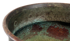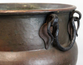 Calderone in rame del XVIII secolo, cm h 31, base in ferro battuto cm h 98, (segni del tempo).