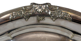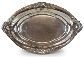 Centrotavola a navicella in Sheffield, decori a motivi di volute, cm h 6,5x40,5x27,5, inizi XX secolo.
