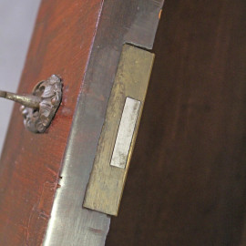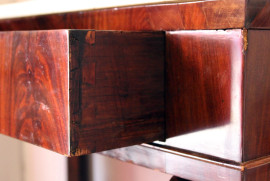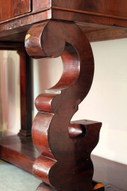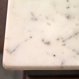 Consolle in piuma di mogano, XIX secolo, piano in marmo, fronte ad un cassetto, poggiante su quattro gambe di cui due frontali a ricciolo, cm h 80x106x53, (difetti, il piano era predisposto per alzata a specchio).