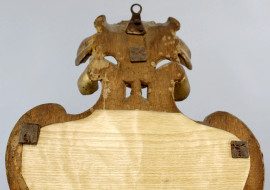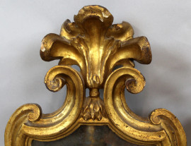 Coppia di appliques a specchio in legno intagliato e dorato a motivo di volute, XIX secolo, altezza cm 55, (difetti).