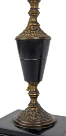 Coppia di candelabri in metallo dorato a cinque fiamme montati a lampada, cm h 44, XX secolo, (segni del tempo e meccanismi da revisionare).