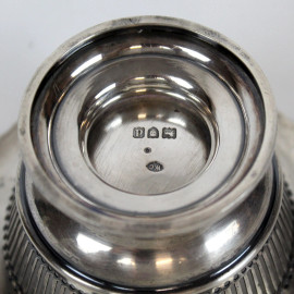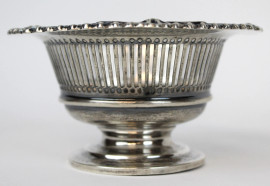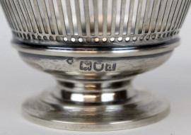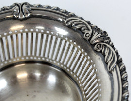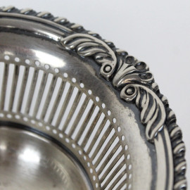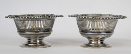 Coppia di cestini in argento, profilo traforato e cesellato, punzoni Inghilterra, fine XIX secolo, cm h 6, diam. cm 11, peso lordo gr.196
