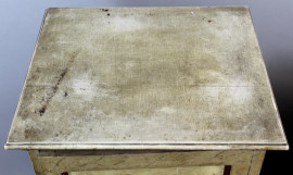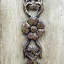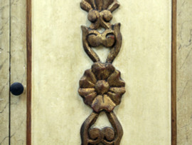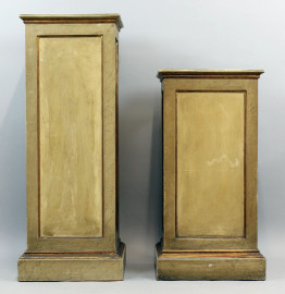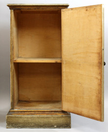 Coppia di mobiletti in legno laccato, XX secolo, fronte ad uno sportello, particolari floreali intagliati, cm h 96, diam. cm 76, (segni del tempo).