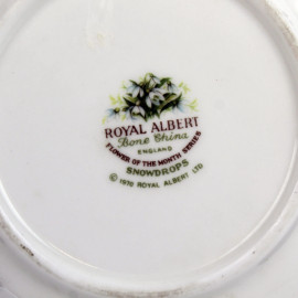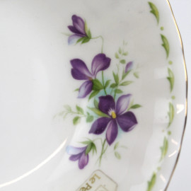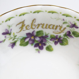 Coppia di piattini in porcellana con decori floreali policromi January e February, diam. cm 13,5, marchio Royal Albert alla base, (lievi difetti).