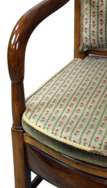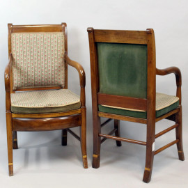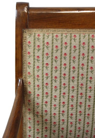 Coppia di poltroncine in noce, XIX secolo, schienali e sedute rivestiti in stoffa ricamata a motivi floreali, gambe a sciabola, cm h 97,5, (segni del tempo).