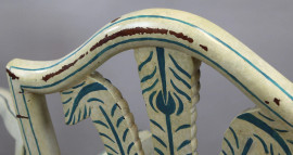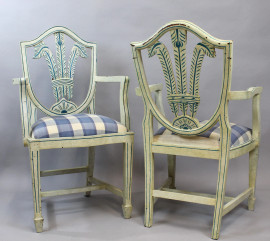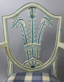 Coppia di sedie in legno laccato e dipinto, XIX secolo, schienale intagliato a foggia di foglie, seduta imbottita e rivestita in stoffa a quadri, quattro gambe troncopiramidali, cm h 107, (segni del tempo).
