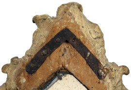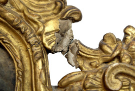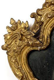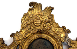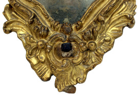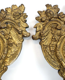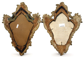 Coppia di specchiere di linea sagomata in legno e pastiglia dorata, XIX secolo, cm h 57, (difetti e mancanze).