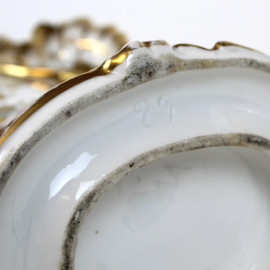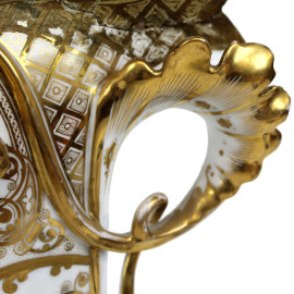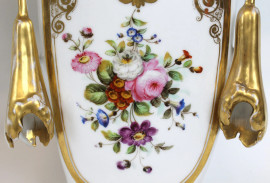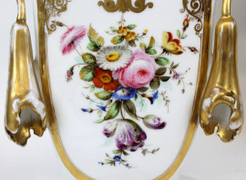 Coppia di vasi Luigi Filippo in porcellana policroma, decoro a motivi di foglie e bouquet di fiori, cm h 39, (difetti, restauri e mancanze).