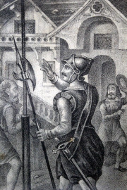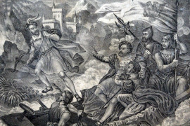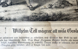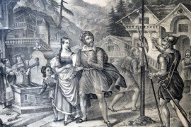 Due stampe raffiguranti il glorioso rifiuto e la fuga dalla nave di Guglielmo Tell, cm 32x38, XIX secolo, entro cornici, (macchie).