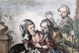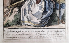 Giuseppe Piattoli (1743-1823), Proverbio toscano, incisione a bulino acquarellata a mano su carta vergata e filigranata, cm 37x28