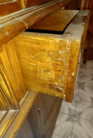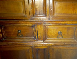 Grande armadio a due corpi in noce, Italia centrale, seconda metà del XVIII secolo, cappello modanato con bordo dentellato, a quattro sportelli suddivisi in riquadri, nella parte inferiore due mezzi cassetti nella fascia e due più grandi, altri quattro sportelli sottostanti, cm h 255x230x65, (segni [..]