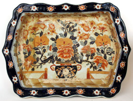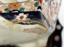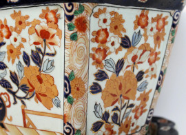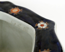 Grande fioriera in porcellana policroma Imari, scene naturalistiche entro riserve e decori floreali, cm h 26x44x29, arte orientale, marchio alla base, inizi XX secolo, (difetti).