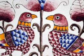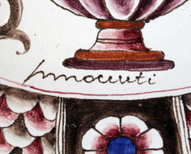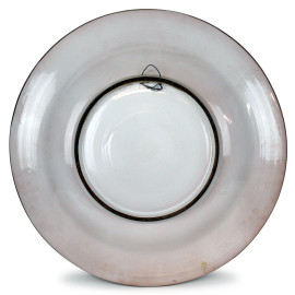 Grande piatto in ceramica policroma raffigurante vaso con fiore e coppia di volatili su rami, diam. cm 50,5, firmato Innocenti, anni '70.