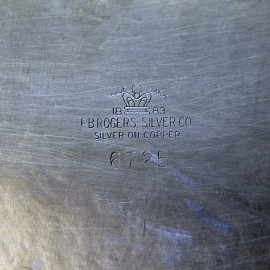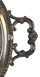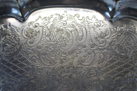 Grande vassoio a guantiera in metallo argentato, decoro floreale inciso, cm 75x58, XX secolo, (segni del tempo).