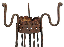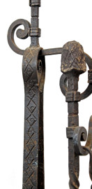 Lotto composto da due basi e quattro attrezzi da camino in materiali diversi, alt. max cm 107, XX secolo, (segni del tempo e mancanze).