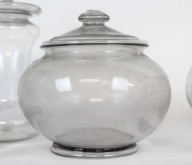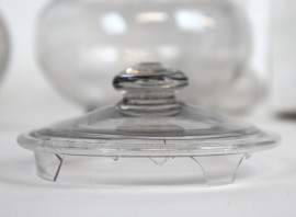 Lotto composto da due bottiglie, due contenitori e due centrotavola porta bon-bon in vetro, alt. max cm 19,5, XX secolo, (difetti).