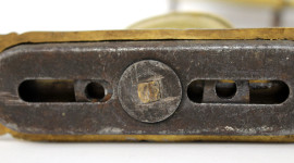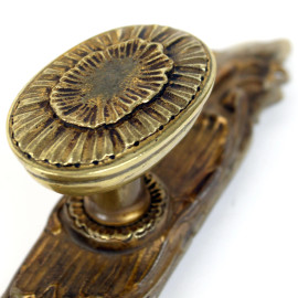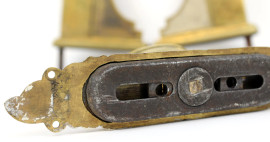 Lotto composto da due reggimensole ed un pomello di linea ovale in ottone, misure max cm 36,5x12, epoche diverse, (difetti).