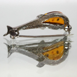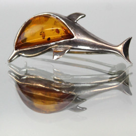 Lotto di due cavallucci marini, due delfini ed una spilla in ambra ed argento, lunghezza max cm 4,5.