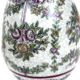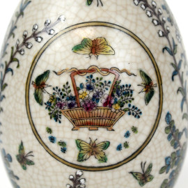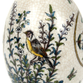 Lotto di due uova in ceramica, decori policromi a motivi floreali e di volatili, cm h 14, (segni del tempo).